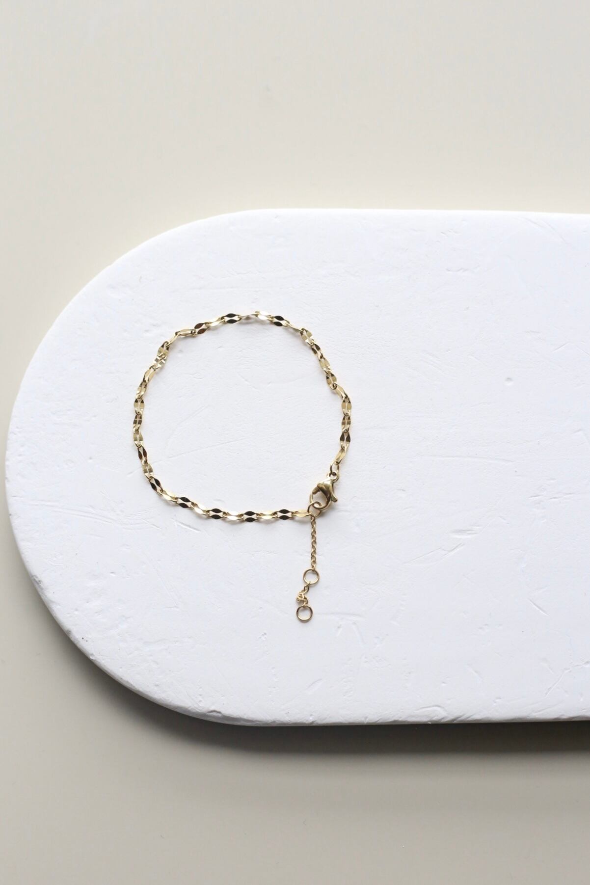 光をつなぐように、繊細に連なるチェーンが手元にさりげない輝きを添えるデザイン。