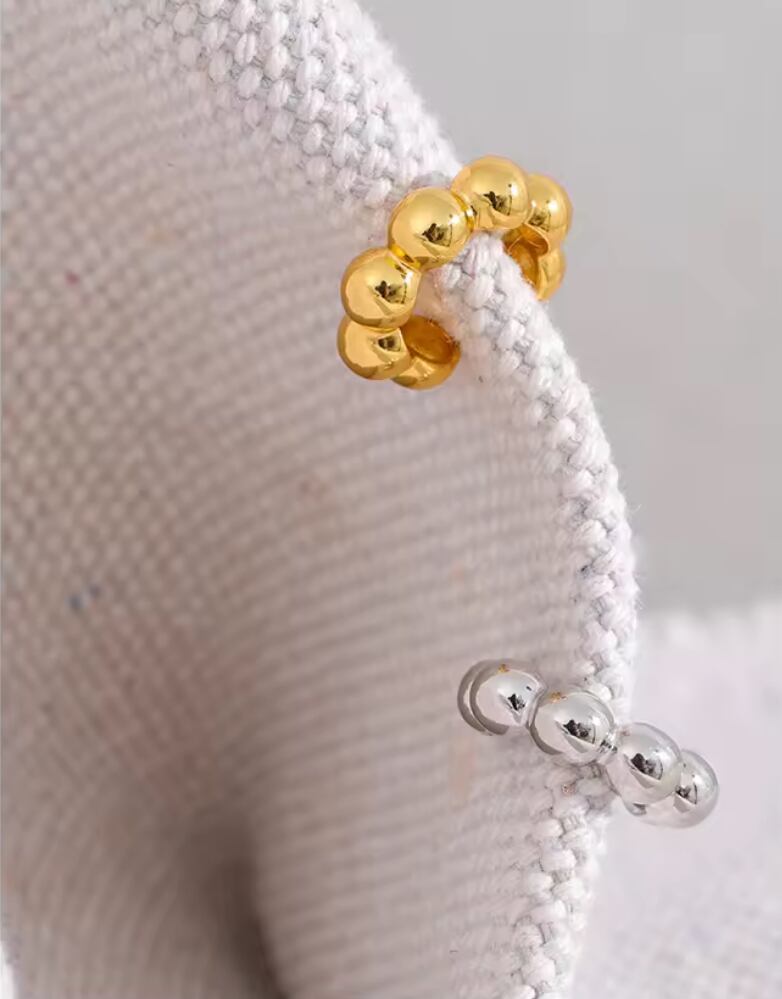 小ぶりで可愛らしい印象を与える【金属アレルギー対応】Orb Cluster ear cuff。丸いフォルムが耳元にさりげなく華やかさをプラスし、日常使いにぴったりです。シンプルなデザインは、カジュアルなスタイルにもフォーマルなシーンにもマッチします。金属アレルギーにお悩みの方でも安心してご着用いただけるステンレス製のイヤーカフです。